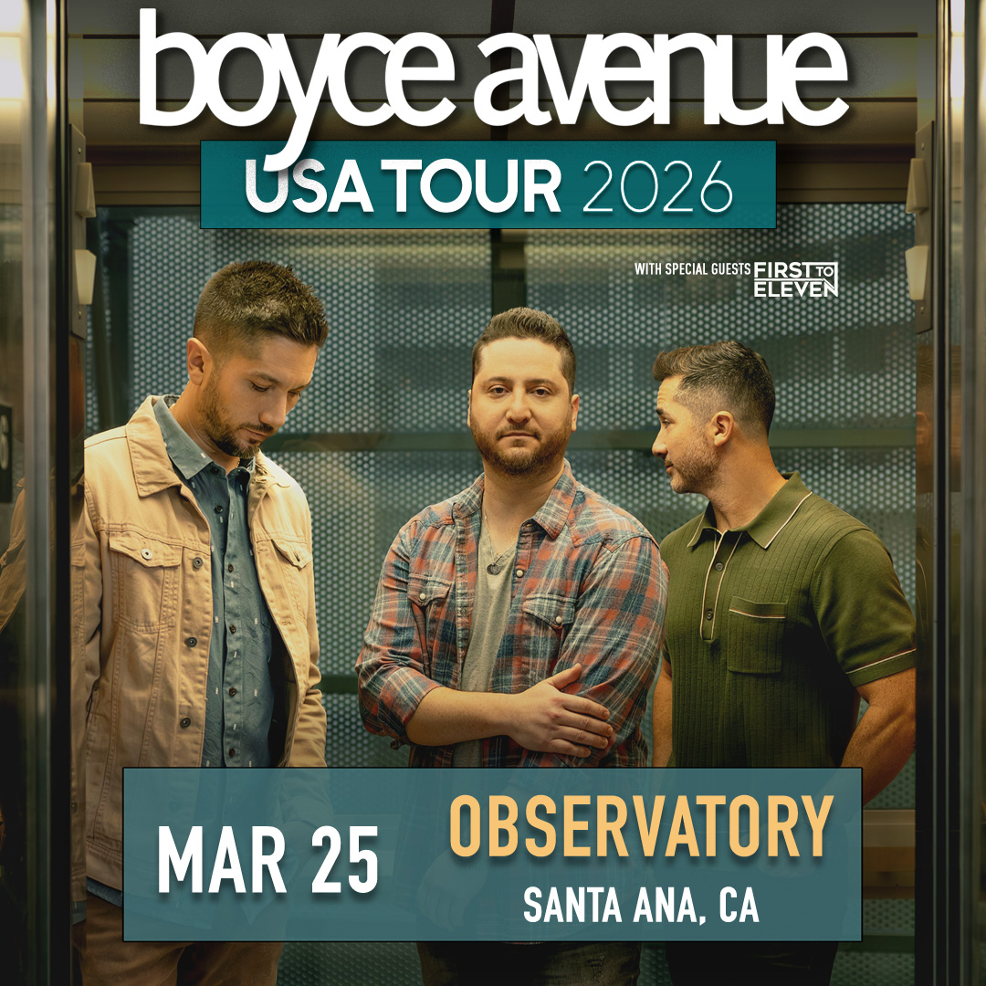Boyce Avenue, a Florida-based trio of brothers known for their strong acoustic roots and melodic rock sound, became YouTube's most-viewed independent band with billions of views. See them live at The Observatory in Santa Ana on Wednesday March 25!