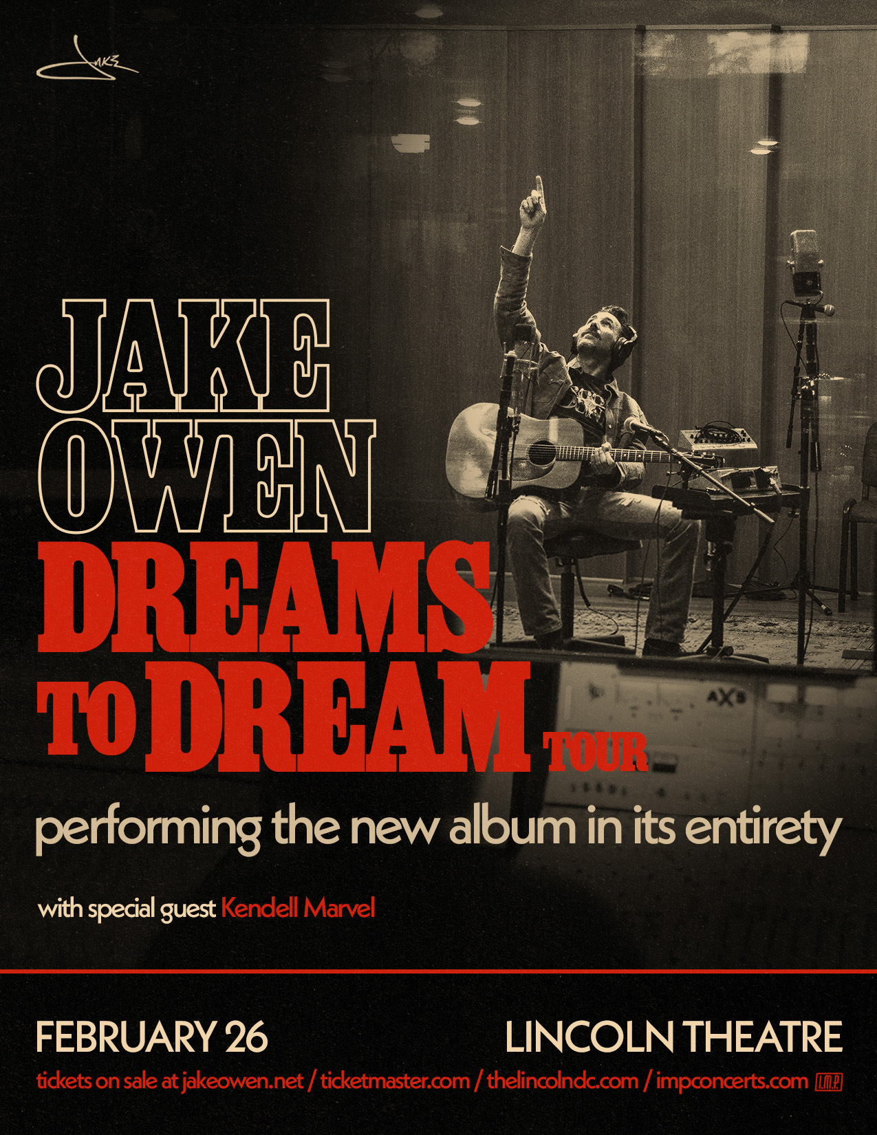 Florida-born country star Jake Owen brings his intimate Dreams to Dream Tour to Lincoln Theatre on Thursday February 26, performing his acclaimed Shooter Jennings-produced album in full. With nine #1 country hits including "Barefoot Blue Jean Night" and "Beachin'," don't miss this acoustic evening with one of Nashville's most captivating crossover stars!