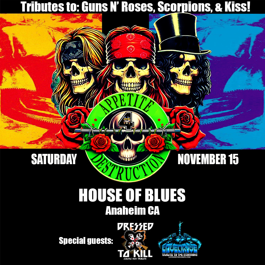 House of Blues Anaheim • Nov 15 "The World's Most Dangerous Tribute Band" Appetite 4 Destruction pays homage to the iconic rock band Guns N' Roses at House of Blues Anaheim on Saturday November 15!