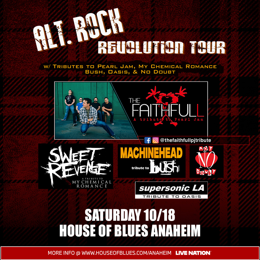 House of Blues Anaheim • Oct 18 Alt-Rock Revolution Tour celebrates 90s and 2000s alternative rock with tribute bands honoring Bush, No Doubt, Oasis, Machinehead, U2, and The Cure. Experience the era's greatest hits live at House of Blues Anaheim on October 18.