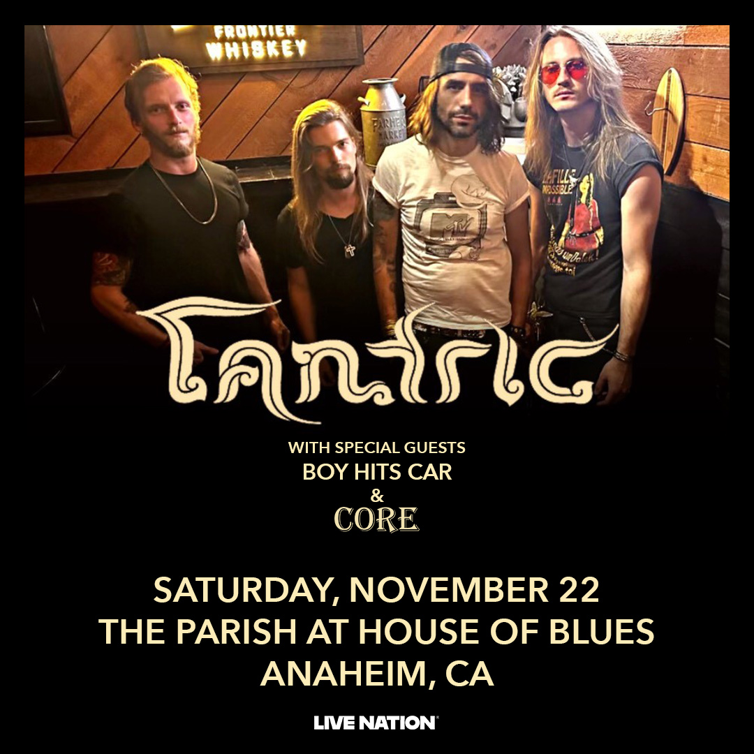 The Parish at House of Blues Anaheim • Nov 22 Boy Hits Car, Tantric & Core are performing on Saturday, November 22 at The Parish at House of Blues Anaheim