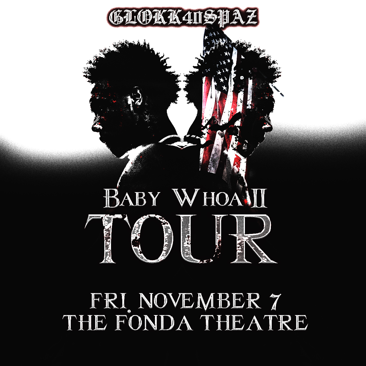 Atlanta's Glokk40Spaz brings raw, energetic dark plugg and trap to the stage on his Baby Whoa 2 Tour. Known for hardcore hits like "Bad Man" and "Free Sumo," the rising rapper delivers intense performances. See him live at Fonda Theatre on November 7, 2025!