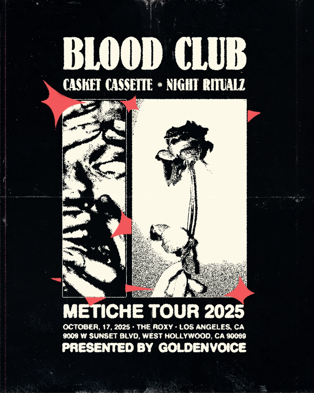 From the South Side of Chicago, blood club is a post-punk band blending the intensity of darkwave and the romanticism of their Latino roots. Founded in 2022 by lead singer Jesse Flores, Blood Club has amassed more than 60,000 monthly listeners on Spotify, building a devoted following in cities like Chicago, Los Angeles and Mexico City. See them live at The Roxy Theatre this Friday!