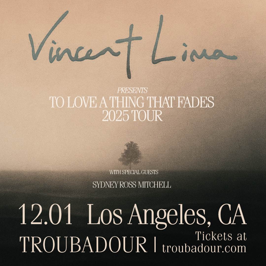 Troubadour • Dec 1 Vincent Lima, a Los Angeles-based singer-songwriter known for his deeply personal lyricism and raw indie-folk sound, explores themes of loss, love, and growing up. See him live at Troubadour on Monday, December 1!