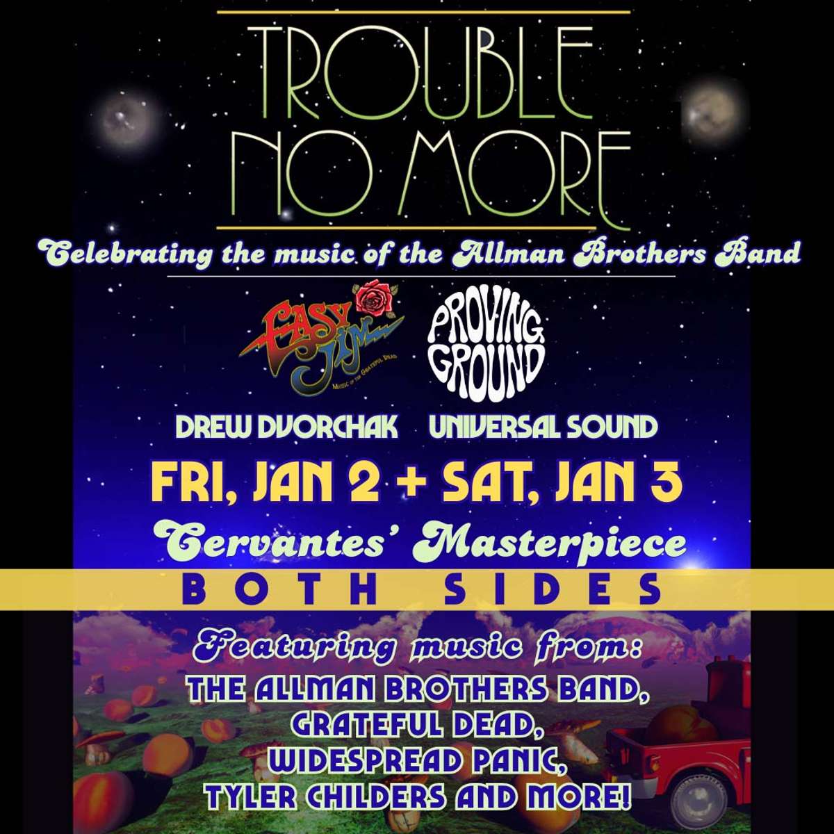 Cervantes' and The Other Side - DUAL VENUE • Jan 2 Easy Jim, Trouble No More, Universal Sound & Proving Ground performed on Thursday, January 2 at Cervantes' and The Other Side - DUAL VENUE