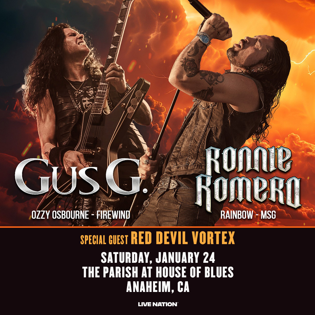 The Parish at House of Blues Anaheim • Jan 24, 2026 Gus G, the Greek guitar virtuoso known as Ozzy Osbourne's shredder from 2009-2017 and founder of Firewind, teams up with vocalist Ronnie Romero. Catch these metal legends at The Parish at House of Blues Anaheim on Saturday, January 24, 2026!