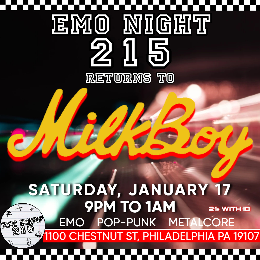 Milkboy • Jan 17, 2026 Relive your emo classics and rage your heart out at Emo Night 215! This DJ party spins emo, pop punk, metalcore, and post-hardcore favorites from My Chemical Romance to Paramore. Dance the night away at Milkboy on Saturday, January 17, 2026!