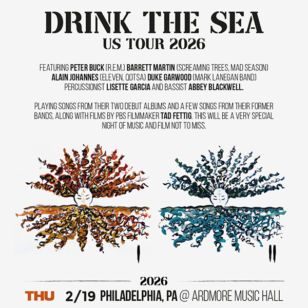Drink The Sea, ft. Peter Buck (of R.E.M.), Duke Garwood, Alain Johannes (of Them Crooked Vultures) Barrett Martin (of Screaming Trees) & Lisette Garcia, live at Ardmore Music Hall on Thursday February 19! Drink The Sea began four years ago in 2022, when Alain and Barrett jammed at Barrett’s studio in Olympia, WA just to see what kind of magic they could conjure together.