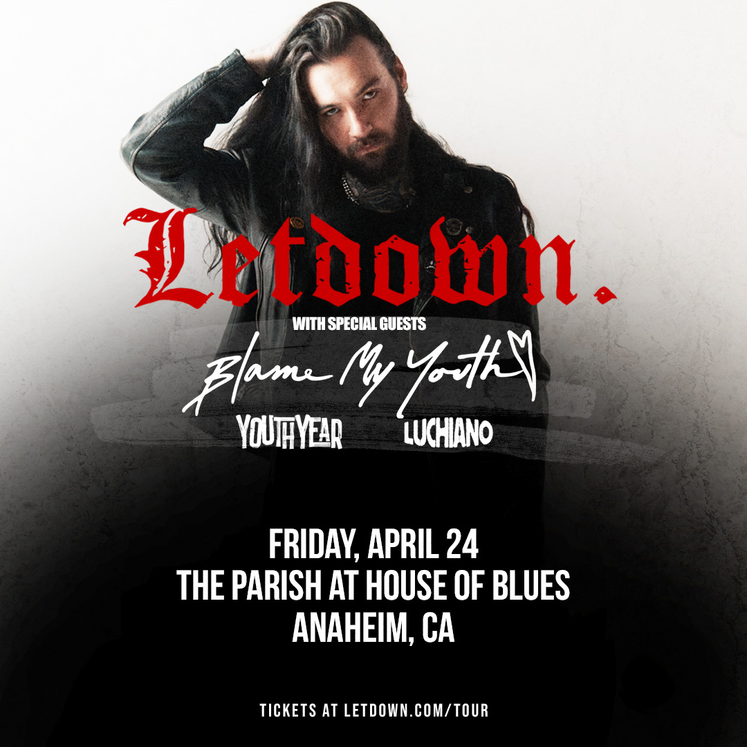Letdown., the alt-rock project of Blake Coddington, blends punk, emo, and pop into cathartic anthems chronicling his mental health journey. With two Top 25 Alternative radio hits, see him live at The Parish at House of Blues Anaheim on Friday, April 24!