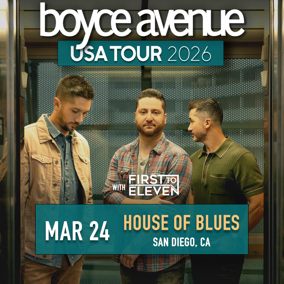 House of Blues San Diego • Mar 24 Boyce Avenue, the Florida-based trio of brothers with over 17 million YouTube subscribers and 7 billion views, brings their signature acoustic covers and melodic rock sound to House of Blues San Diego on Tuesday March 24!