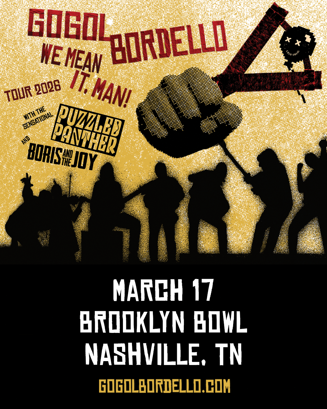 Combining elements of punk, Gypsy music, and Brechtian cabaret, Gogol Bordello tells the story of NYC's immigrant diaspora through debauchery, humor, and surreal costumes. Supporting their new album "We Mean It, Man!"—their "post-punk groove revenge"—see them live at Brooklyn Bowl Nashville on March 17!