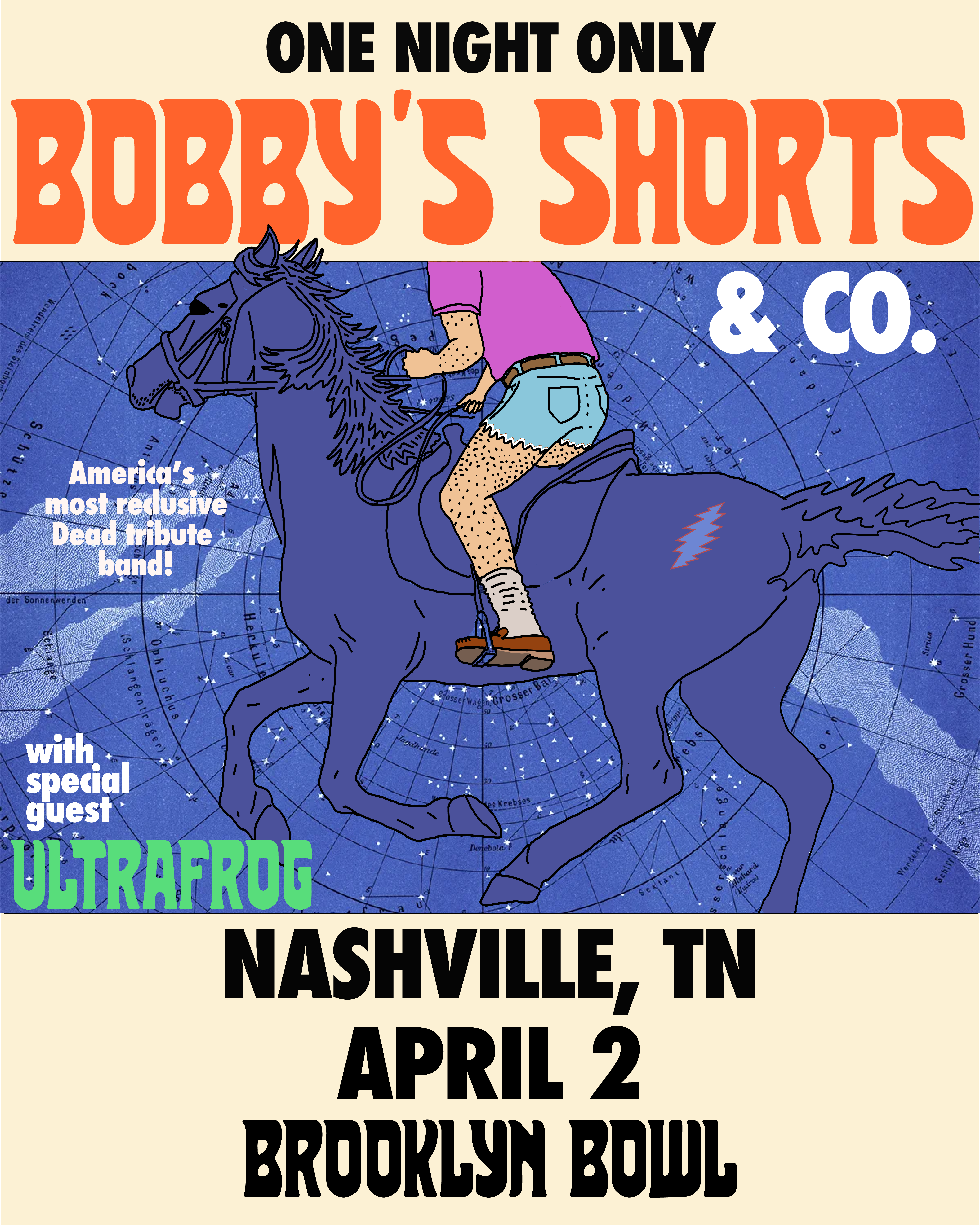 Bobby's Shorts, America's most reclusive Dead tribute band featuring members of Futurebirds and Athens, GA's hottest musical talent, honors Bob Weir's legacy with a rare performance of Grateful Dead classics at Brooklyn Bowl Nashville on Wednesday, April 2!