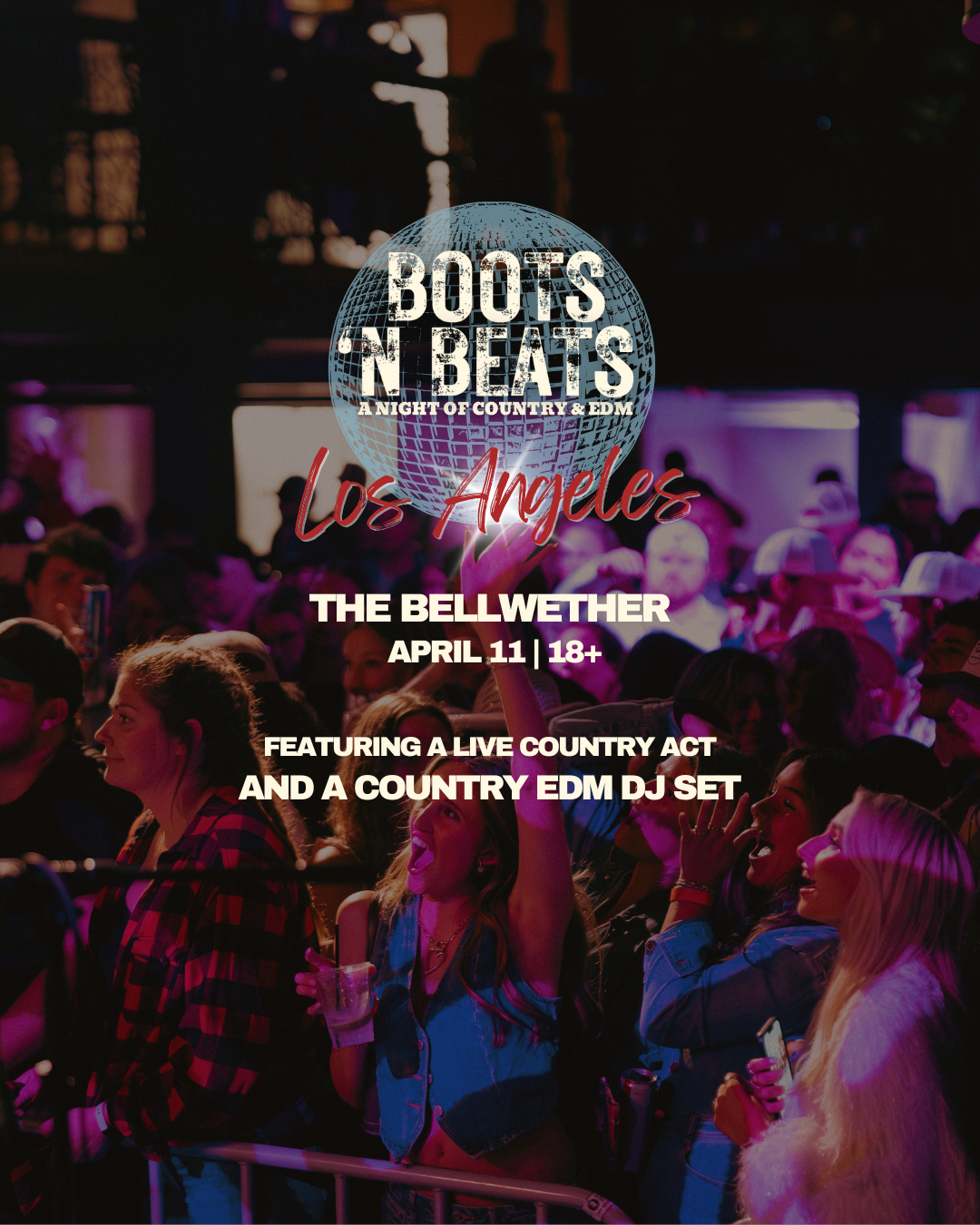 Get ready for the ultimate genre fusion! Boots 'N Beats brings a one-of-a-kind night combining country hits with EDM beats. Grab your cowboy hats and dancing boots for live country music followed by a headlining Country-EDM DJ set at The Bellwether this Saturday!