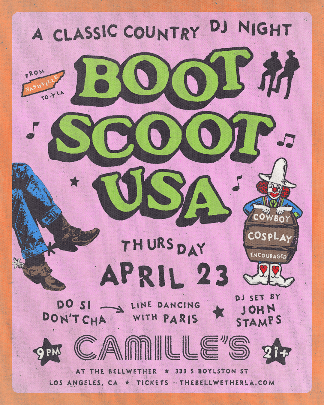 Boot Scoot USA is the original classic country DJ party — an immersive hoedown featuring vintage western wear, line dance lessons, and '90s & 2000s honky-tonk hits all night long. Grab your boots and join the fun at Camille's at The Bellwether on Thursday April 23!