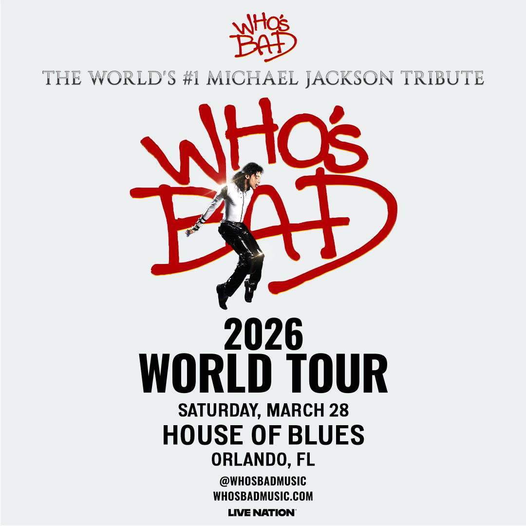 Who's Bad, the longest-running Michael Jackson tribute band, delivers a jaw-dropping celebration of pop music's one true King with over 20 years of thrilling fans worldwide. See them live at House of Blues Orlando on Saturday March 28!